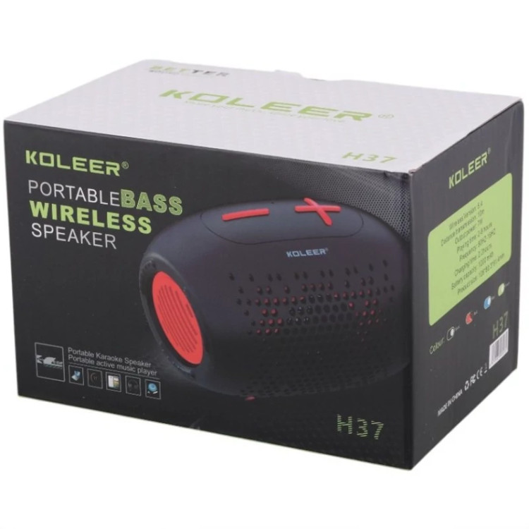 اسپیکر بی سیم قابل حمل Koleer مدل H37 تامین انرژی به وسیله باتری داخلی با ظرفیت 1200 میلی آمپر ساعت با امکان شارژ مجدد توسط پورت USB Type-C و کابل همراه اتصال بی سیم از طریق بلوتوث نسخه 5.4 با برد موثر 10 متر، محدوده پاسخ فرکانسی در رنج داینامیکی برابر با 80 هرتز الی 16 کیلوهرتز مدت زمان لازم جهت تامین شارژ حدود 2.2 ساعت، زمان نگهداری شارژ در حالت پخش موسیقی حدود 2 الی 8 ساعت، میزان توان خروجی 7 وات متریال ساخت بدنه پلاستیک با کیفیت مقاوم در برابر ضربه و فشار احتمالی، تعبیه کلید فیزیکی روی بدنه به منظور مدیریت میزان صدا و موسیقی پشتیبانی از حافظه رم میکرو SD و فلش مموری USB به منظور پخش فایل های ذخیره شده، برخورداری از بند تعبیه شده بر روی بدنه به منظور سهولت در حمل