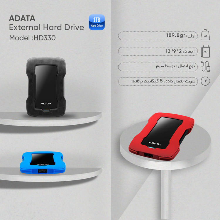 هارد «HD330» با ظرفیت یک ترابایت محصولی مقاوم از شرکت «ای دیتا» (ADATA) است که از طریق رابط USB3.1 به کامپیوتر متصل میشود. بهره بردن از رابط USB3.1 در این محصول باعث شده که بتواند اطلاعات را با سرعت زیاد انتقال دهد. این محصول بدنهای مستحکم با پوشش سیلیکونی دارد که قادر است در برابر سقوط و ضربات روزمره مقاومت کند. وزن این هارد 189.8 گرم است و به راحتی میتوان آن را در کیف لپتاپ خود قرار داده و همیشه با خود همراه داشت. نکتهای که باید به آن توجه کنید این است که برای اتصال این هارد از طریق رابط USB 2.0 به دو درگاه USB نیاز خواهید داشت؛ برای این کار باید از کابل Yشکل USB استفاده کنید. پشتیبانی از فرآیند رمزنگاری AES باعث میشود که از امنیت اطلاعات خود مطمئن شوید. هارد HD330 با سیستمعاملهای مختلف از جمله نسخههای گوناگون سیستمعامل ویندوز و مک به خوبی سازگار است. این محصول در سه رنگ آبی، مشکی و قرمز روانه بازار شده است.