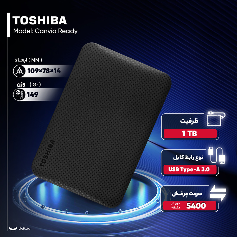 هارد اکسترنال توشیبا مدل Canvio Ready ظرفیت یک ترابایت دارای رابط USB Type-A 3.0