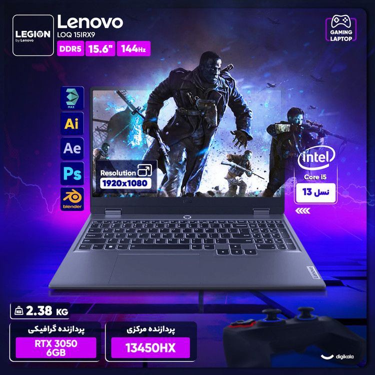 مدل LOQ 15IRX9 از سری LOQ لپتاپهای لنوو، یکی از بهترین لپتاپ های میان رده مخصوص بازی موجود در بازار به شمار میآید. این لپتاپ از طراحی بهروز و چشم نوازی برخوردار است که نظر اکثر گیمرها را به خود جلب میکند. بدنه به صورت کلی 2.38 کیلوگرم وزن دارد. صفحه نمایش 15.6 اینچی با پنل IPS این مدل یکی از نقاط قوت آن محسوب میشود. رزولوشن نمایشگر Full HD (1920 x 1080) بوده و نرخ بهروزرسانی 144 هرتزی دارد و در کنار پشتیبانی از فناوری G-SYNC تجربهای روان و لذت بخش برای گیمرها به همراه خواهد داشت. پنل مذکور در کنار دقت رنگ بالایی که دارد؛ تا حداکثر 300 نیت روشنایی تولید میکند که به کمک پوشش مات ضد انعکاس برای استفاده در محیطهای پرنور هم مناسب خواهد بود. این لپتاپ به پردازنده مرکزی قدرتمند نسل 13 اینتل مدل Core i5 13450HX مجهز شده که از 10 هسته و 16 رشته پردازشی بهره میبرد. این پردازنده از دامنه فرکانس 1.8 تا 4.6 گیگاهرتزی به همراه 20 مگابایت حافظه کش برخوردار است. در ضمن پردازنده گرافیکی مجتمع UHD Graphics اینتل در این مدل به کار گرفته شده. برای پردازش بازیها و امور گرافیکی سنگین، پردازنده گرافیکی GeForce RTX 3050 با 6 گیگابایت حافظه GDDR6 اختصاصی در دل لپتاپ تعبیه شده که از فناوری DLSS هم پشتیبانی میکند. به این ترتیب این سیستم از توانای کافی برای اجرای بازیهای جدید با تنظیمات گرافیکی بالا و نرخ فریم مناسب برخوردار است. حافظه رم DDR5 با سرعت 4800 مگاهرتز، در کنار حافظه SSD از نوع PCIe NVMe M.2 نسل 4، سرعت بالای این لپتاپ را در بوت، اجرای همزمان برنامهها و انتقال فایلها تضمین میکنند و تجربه کاربری را بهبود میبخشند. باتری چهار سلولی با ظرفیت 60 وات ساعت و کیبورد با نور پس زمینه سفید از دیگر ویژگیهای مهم LOQ 15IRX9 به شمار میآیند.