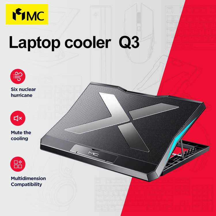 کمپانی ام سی از سال 2014 فعالیت خود در زمینه تجهیزات جانبی کامپیوتر را آغاز کرده و با طراحی های خاص و چشم نواز و طراحی صنعتی حساب شده و کارآمد توانسته جای خود را در بین برند های مطرح بخوبی باز کند . کولپد ام سی مدل Q3 با ظاهری بسیار شیک و زیبا ، دارای 6 عدد فن ارتقا یافتهی بیصدا است که سیستم خنک کنندهی فوقالعادهای دارد . طراحی دستگاه به گونهای است که دارای منافذ زیادی برای سیستم خنک کنندگی بهبود یافته تر است و جریان هوا را به خوبی هدایت میکند . یک بافل تاشو در پایین دستگاه تعبیه شده تا از سر خوردن لپتاپ جلوگیری کند . یک عدد ولوم چرخشی برای تنظیم سرعت فن ها در پشت دستگاه قرار دارد که با توجه به دما آن را تنظیم کنید . همچنین این کولپد دارای دو عدد پورت USB است که در صورت اشغال بودن پورت های USB لپتاپ ، میتوانید از یکی از پورت ها برای اتصال لوازم جانبی از قبیل ماوس ، کیبورد و … استفاده کنید . توصیه : برای بهره وری بهتر کول پدها و اشغال نشدن پورت USB و جلوگیری از آسیب احتمالی به پورتهای لپ تاپ ، بهتر است در زمان دسترسی به برق شهری ، کول پد را به وسیله یک شارژر قدیمی موبایل روشن نمایید .